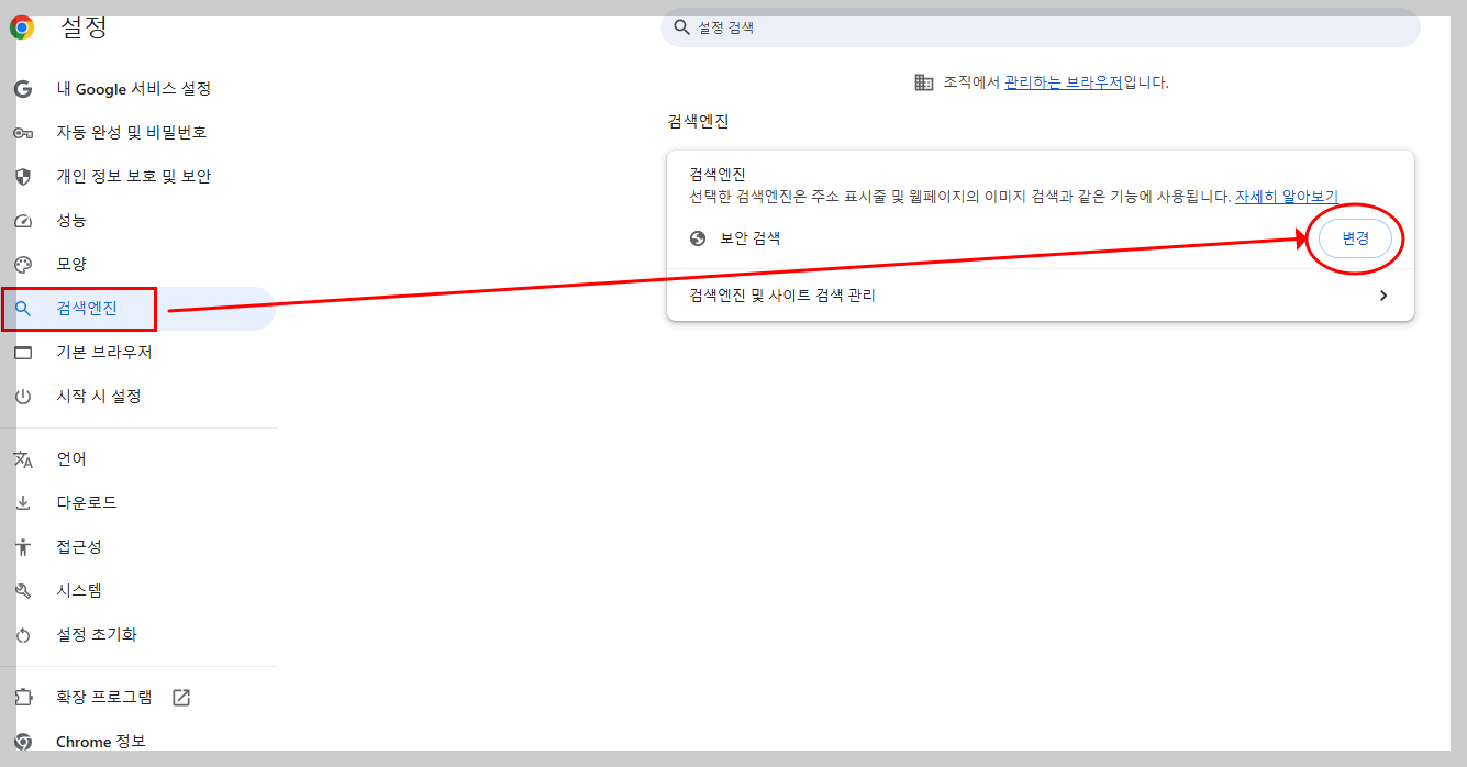 좌측 메뉴에서 검색엔진을 클릭한 뒤, '변경' 버튼을 누릅니다. 기본 검색 엔진이 Google이 아닌 다른 엔진으로 설정되어 있을 수 있습니다.